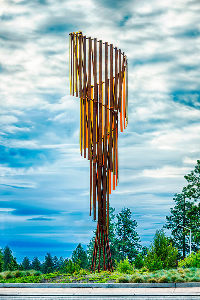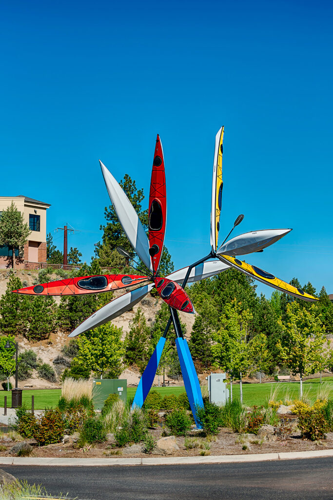 そのほかにも、地元の人々から“Flaming Chicken”の愛称で親しまれる初期の代表作 Phoenix Rising 、ベンドらしい水辺のアクティビティを象徴する9艘のカヤックで構成された Yakaya、市政100周年を記念した Centennial Logger、鋼鉄製のブレード60枚を用いて高さ39フィート(約11m)で火山の営みを表現した High Desert Spiralなど、どの作品もベンドとのつながりを感じさせるストーリーが込められています。Visit Bend の公式ガイドでは、作品ごとの解説も詳しく紹介されています。