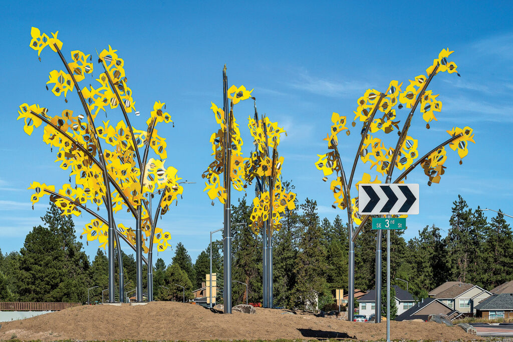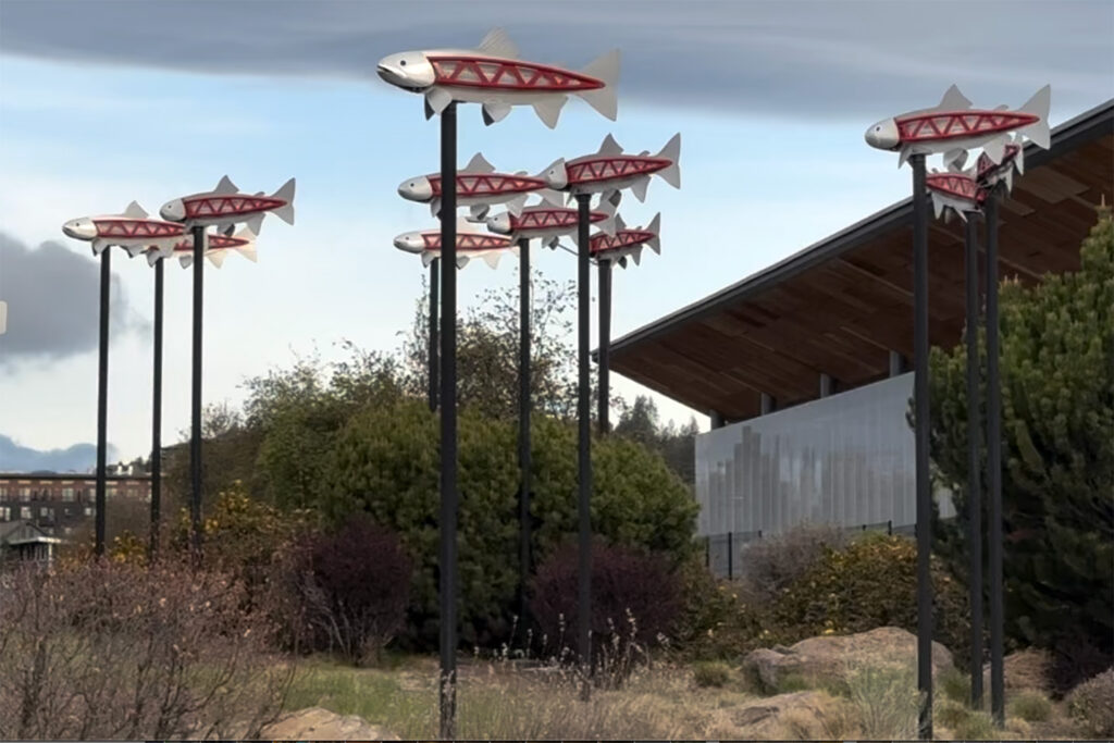 ラウンドアバウトに展示されている作品は作家もテーマも多様です。2001年に設置された最初の作品のひとつ Redsides は、デシューツ川に生息するレッドバンドトラウトへのオマージュ。風に揺れて動く姿は、川を遡上する魚の群れを思わせます。