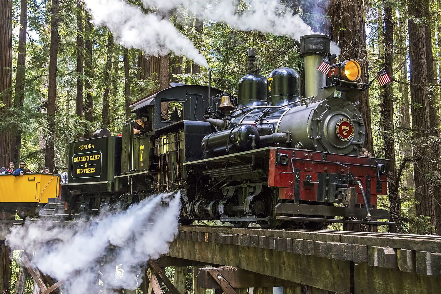 レッドウッドの森の中を走る1880年代の蒸気機関車やサンタクルーズへ向かう1920年代のビーチトレインを運行。