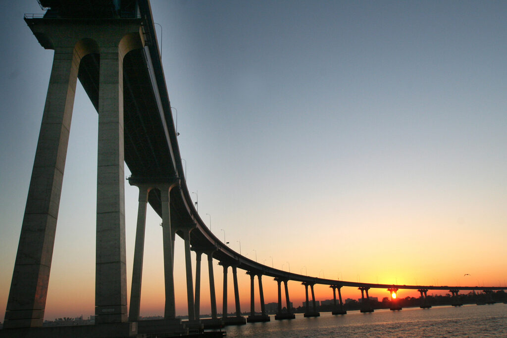サンディエゴ(San Diego)のダウンタウンと、対岸のリゾート地コロナド(Coronado)を結ぶコロナド・ブリッジ(San Diego–Coronado Bridge)は、サンディエゴ湾の上に美しい弧を描くランドマークです。青い海と空を背景に優雅なカーブを描く姿は、都市の象徴として長く愛され続けています。1969年に完成したこの橋は、単なる交通の架け橋ではなく、この地の発展の歴史と深い関わりを持っています。
