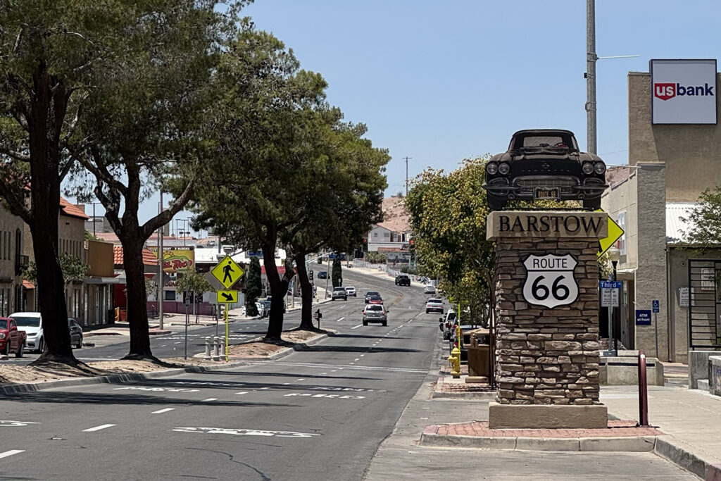 この日の目的地は、砂漠地帯にある歴史ある街・バーストー(Barstow)。この町はデスバレーに南側からアクセスする人やラスベガスを目指すドライバーたちにの立ち寄りポイントとして知られています。2026年に100周年を迎えるルート66(Route66)も、かつてこの町を通過していました。町の中心にはルート66ゆかりのスポットがあり、市街から少し東へ進み、I-40と並行して走るナショナルトレイル・ハイウェイ(Historic Route 66)を30分ほど進めば、映画『バグダッド・カフェ』の撮影が行われたカフェも現存しています。そのすぐ近くには路面に書かれた「Route66」のサインもあり、ルート66をロードトリップで訪れた記念になる1枚を撮影することもできます。