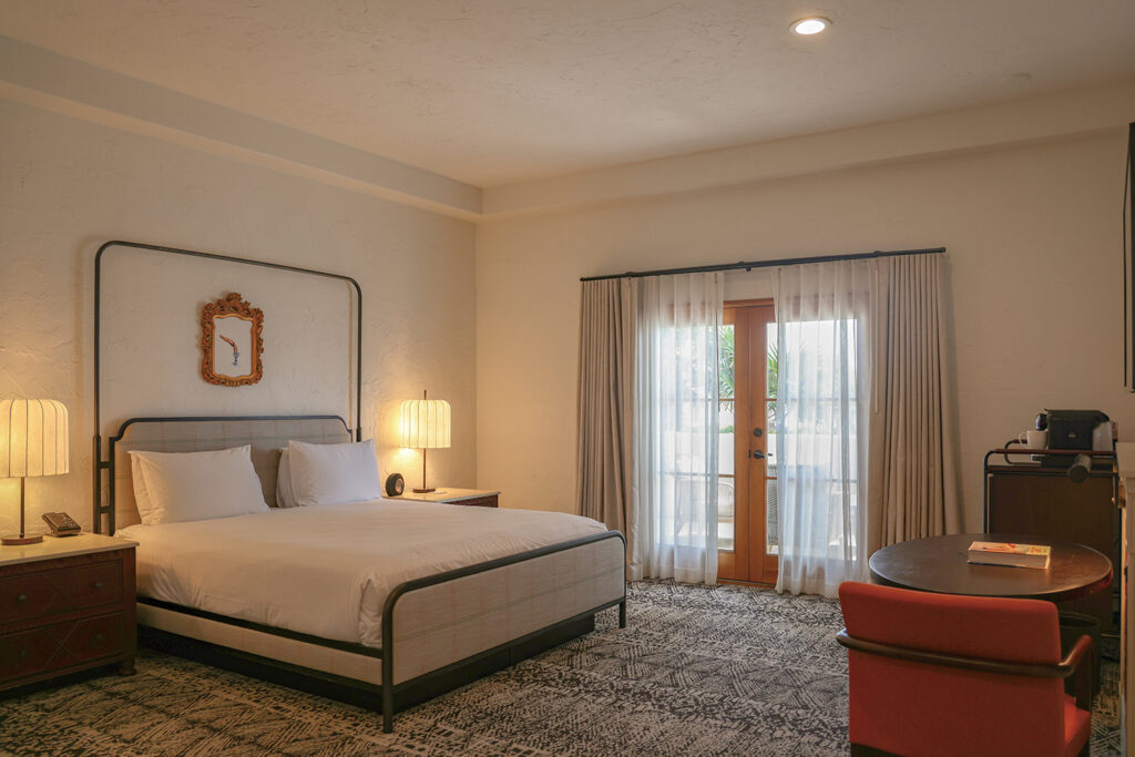 ロビーや客室には、職人の手仕事を感じさせる木製家具やアーチを描く窓、柔らかな色彩のファブリックが配され、どこか地中海リゾートの邸宅を思わせる雰囲気が漂います。館内の随所に飾られた地元アーティストの作品もサンタバーバラらしいアートの魅力を引き立てています。客室はスイート3室を含む全200室で、オーシャンビュー、マウンテンビューなど部屋によって異なる眺望が楽しめます。一部客室にはプライベートバルコニーがあり、朝日や夕暮れを眺めながらゆったりとした時間を過ごせます。ナチュラルウッドを基調とした落ち着きある室内空間は、旅の疲れを癒すくつろぎの空間です。