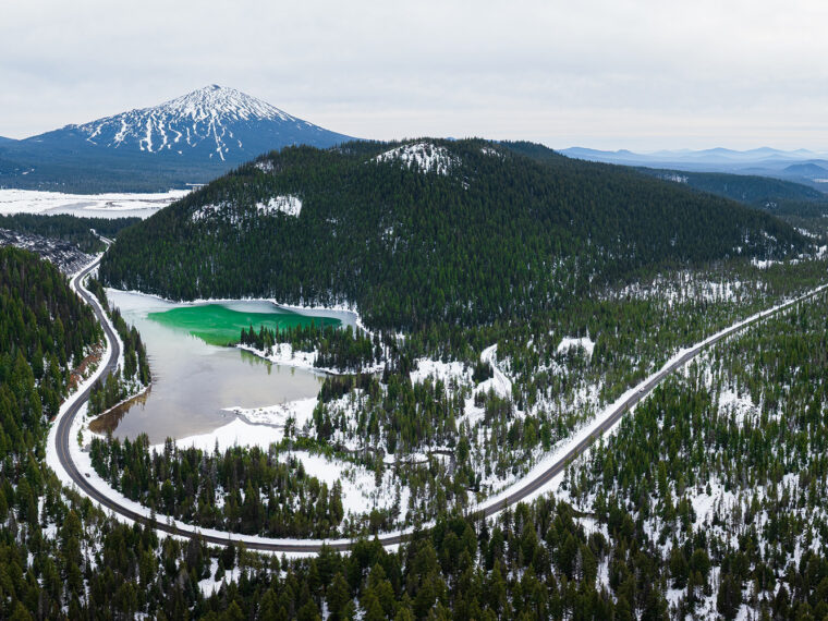 標高を上がるにつれ、森林はマツやモミ、ツガが混在する深い森へと変化し、やがて視界の先に標高2764mのバチェラー山(Mt. Bachelor)が雄大に姿を現します。ここから分岐を進むと、オレゴン最大規模を誇るマウント・バチェラー・スキーリゾート(Mt. Bachelor Ski Resort)へアクセスできます。標高差約1,000m、面積3,700エーカーのスキーエリアは例年6月頃までオープンしており、夏季にはリフトで標高2,700m付近まで上がり、山頂ロッジからカスケード山脈の絶景を楽しむことができます。