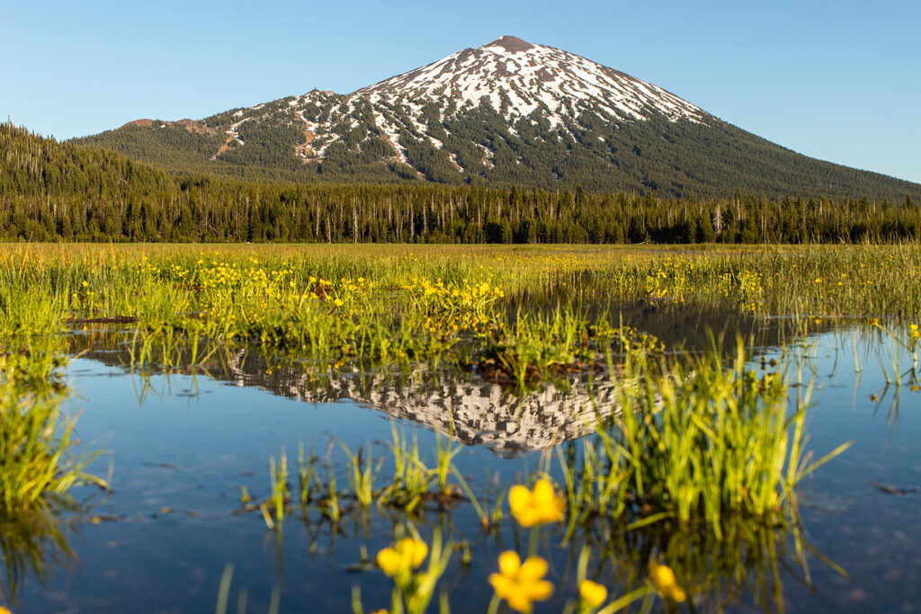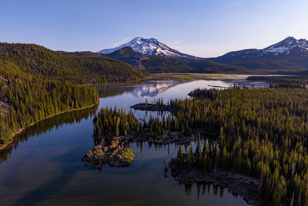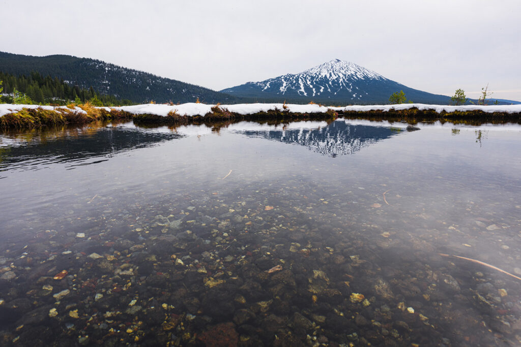 バイウェイに戻り、ダッチマン・フラット(Dutchman Flat)へと下ると、侵食によって火口内部が露出した珍しい成層火山、ブロークン・トップ(Broken Top)が見えてきます。火山と氷河がつくり出した地形を象徴する山で、周辺には大小の湖が点在します。その中でも代表的なのがスパークス湖(Sparks Lake)。およそ100ヘクタールに広がる湖は、サウス・シスター(South Sister)を映す鏡のような湖面と、溶岩台地を縁取る荒々しい地形が織りなす絶景で知られています。オレゴン州を代表する写真家レイ・アトキソン(Ray Atkeson)が愛した景勝地としても有名で、彼の名を冠したハイキングトレイルも整備されています。なお、湖へのアクセス道は未整備の砂利道のため、5月下旬〜6月上旬は車高の低い車両は通行できない可能性があります。