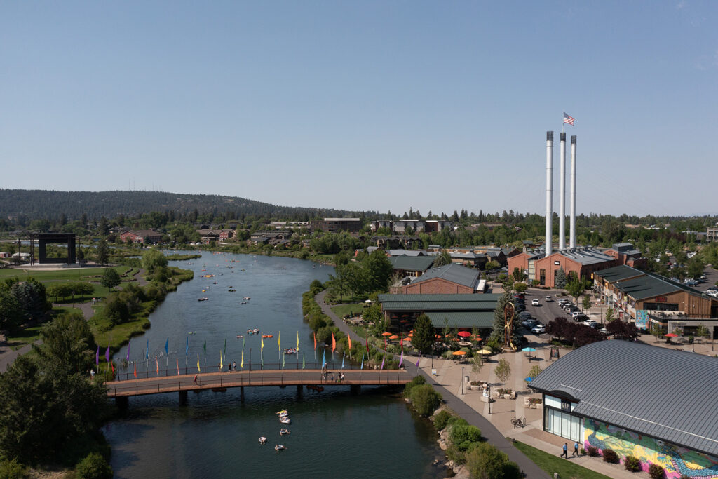 出発点となるベンド(Bend)は、カスケード山脈の東麓に位置するセントラル・オレゴンの中心都市。年間を通してアウトドアを楽しめる人気の拠点です。市街地を流れるデシューツ川(Deschutes River)沿いには、人気クラフトビールブランドのブルワリーやショップ、レストランが並びます。ダウンタウン北側のドレイク・パーク(Drake Park)や、製紙工場跡地を再開発したオールド・ミル・ディストリクト(Old Mill District)など、自然と都市が調和した風景も魅力です。
