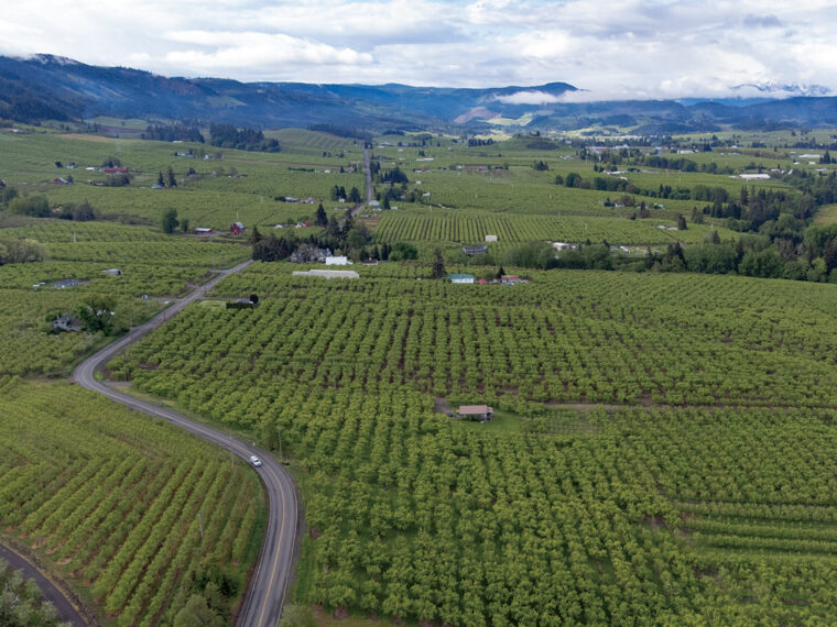 フッド・リバー(Hood River)は、ウィンドサーフィンとフルーツの産地として知られる町です。州道35号(OR-35)の一部は「フルーツ・ループ(Fruit Loop)」と呼ばれる周遊道路と重なり、リンゴやサクランボの花が咲く春や、収穫を祝う秋には地元の活気に包まれます。沿道ではフルーツを使ったサイダーやパイなどのローカルフードも楽しめ、このエリアならではの風景と味覚が旅を彩ります。