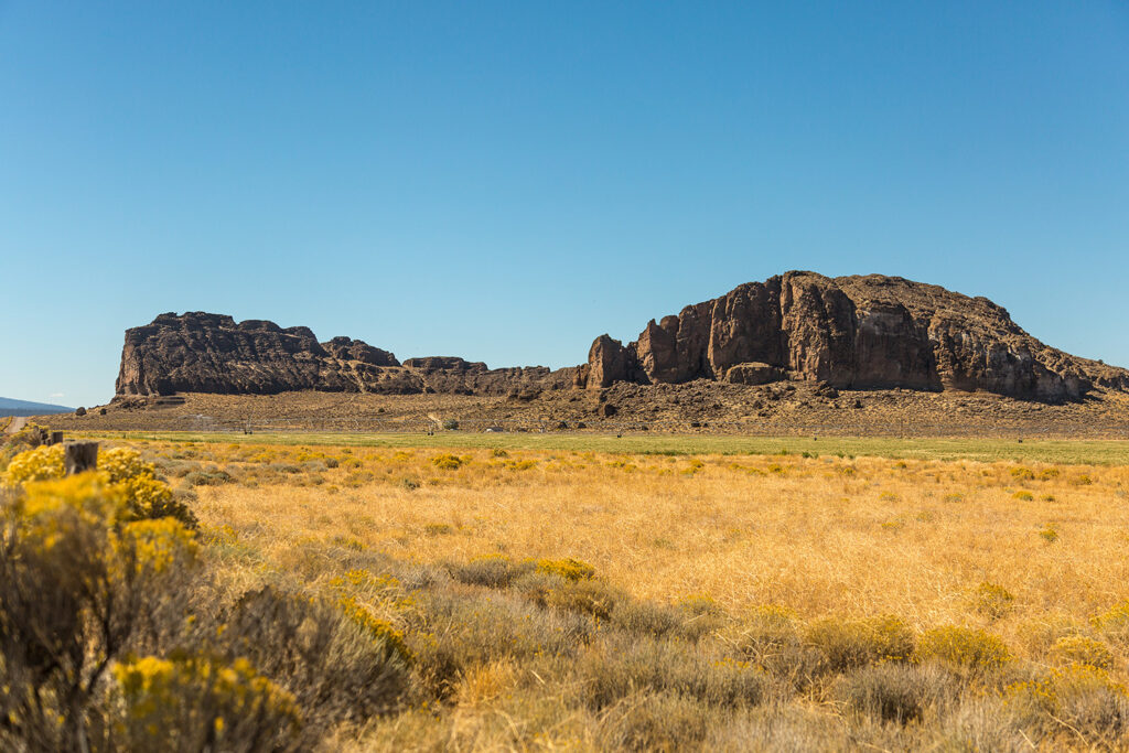 アウトバック・シーニック・バイウェイはベンド(Bend)から南へ約30マイル(48km)の町ラパイン(La Pine)から始まります。U.S.ルート97号(U.S. Route 97)を経て州道31号へと進むとデシューツ国有林へと入り、ロッジポールパインやポンデローサパインが並ぶ森の中へ。さらに南下すると、やがてオーストラリアのアウトバックを思わせる広大なセージブラシ平原へと辿り着きます。風景の劇的な変化を感じながら、数マイル先のカウンティロード5-10(County Rd 5-10)へと進むと、目の前に神秘的な奇岩フォートロック(Fort Rock)が現れます。まるで要塞のようにそびえ立つその岩壁は高さ約100mにもなる火山性クレーターで、国立天然記念物に指定されています。周辺にはトレイルやピクニックエリアが整備されたフォートロック州立ナチュラルエリア(Fort Rock State Natural Area)や、19世紀の開拓時代の建物を移築保存するフォートロック・ホームステッド・ビレッジ(Fort Rock Homestead Village Museum)などの見どころもあります。