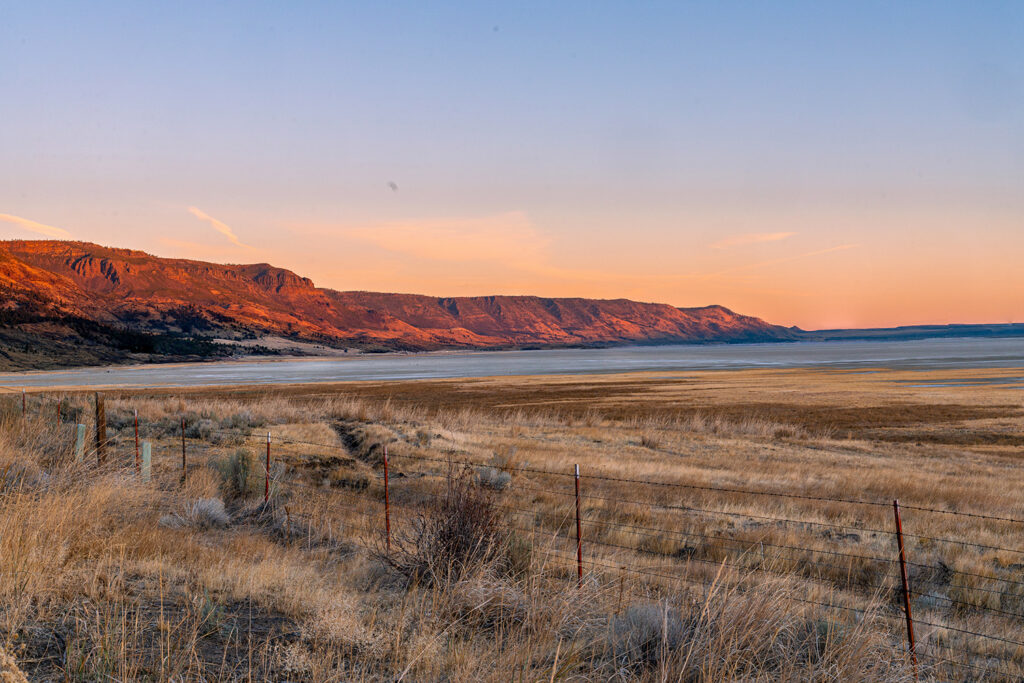 さらに南へ進むと、ニジマスや在来種のレッドバンドトラウトが生息するチェワウカン川(Chewaucan River)が流れ、北米最古の人類遺跡のひとつとして知られるペイズリー洞窟(Paisley Caves/非公開)で有名な町ペイズリー(Paisley)を通過します。やがて、全米最大級の牧場のひとつZX牧場の牧草地帯を望みながら走ると、U.S.ルート395号(U.S. Route 395)との合流地点となるバレーフォールズ(Valley Falls)に到着します。東側には高さ約2500フィート(約762m)、長さ約48kmにもおよぶ北米最大の露出断層崖アバート・リム(Abert Rim)が圧倒的な存在感を放ちます。