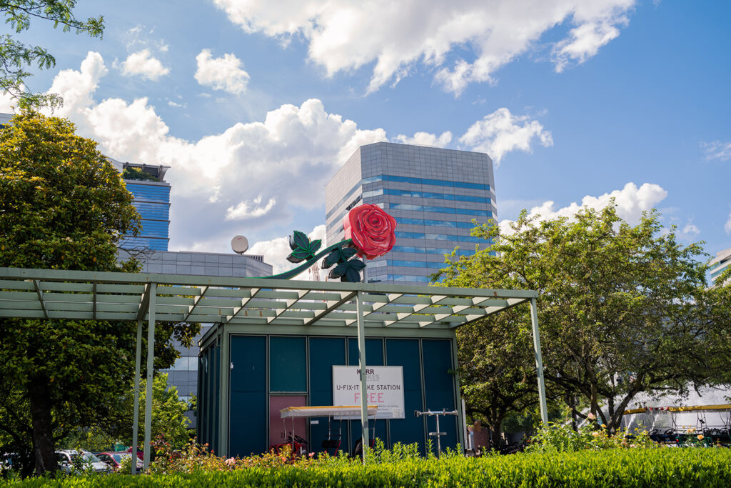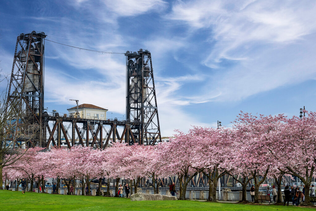 公園からはポートランドを代表する複数の橋を望むことができます。南側には、1908年完成の鋼鉄製リフトブリッジとして知られるホーソーン・ブリッジ(Hawthorne Bridge)。北に進むと、上下2層構造で鉄道と車道を分けるスティール・ブリッジ(Steel Bridge)が現れます。どちらもポートランドの歴史を語る貴重な存在で、工業美と都市景観が融合した絶景です。夕方には橋のシルエットが川面に映り込み、写真撮影にも人気のスポットです。